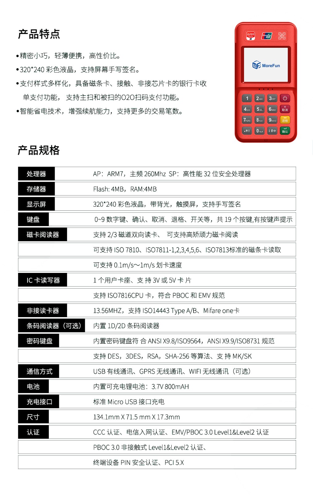 首页>>山东产品中心>>山东手持无线POS 山东联动优势-优POS Pro 高配版 * 性能优越:32位高性能ARM11安全CPU;整机通过业内更先进的PCI PED4.X 安全认证及国内受理终端PIN输入设备安全评估检测认证,多项措施保障金融交易的安全;* 时尚外观:外形小巧携带方便,高抗跌落性能、宽工作温度、防水防尘设计、外壳坚固耐刮、户外携带式作业更加耐久可靠。* 通讯备份:支持2G-3G扩展;* 超长续航:3.7V-800毫安稳定续航能力,智能电池管理保证持续工作18小时,待机72小时。 标准配置 返 回
